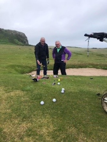 It’s at this point that Mr Captain decided to enhance his reputation as Mr Entertainments by contriving to set off his trolley and golf bag in a Kamikaze raid on one of the bunkers. That wouldhave been bad enough but most of the pockets on his golf bag were open and the contents were now buried in the soft bunker sand. As well as balls and tees there was an assortment of ancillary equipment retrieved that it is best not talking about. Undeterred but with a smashed Driver Mr Captain managed to complete the course.  |
